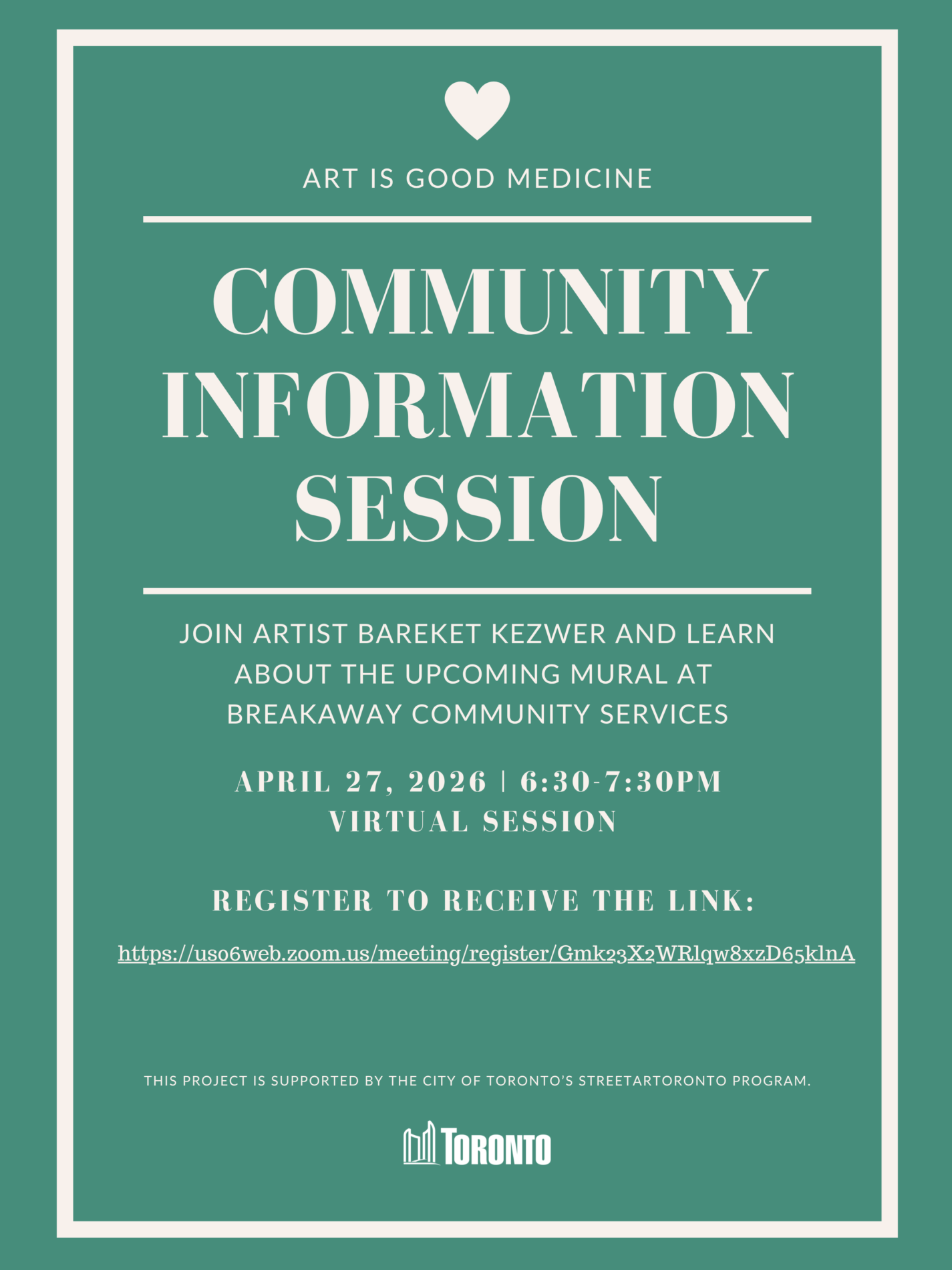 Art is Good Medicine brings community voices into the public realm through a collaborative mural at Breakaway Community Services in Parkdale, with support from StreetARToronto. The project invites reflection, participation, and the chance to contribute to a shared visual presence on the street.
